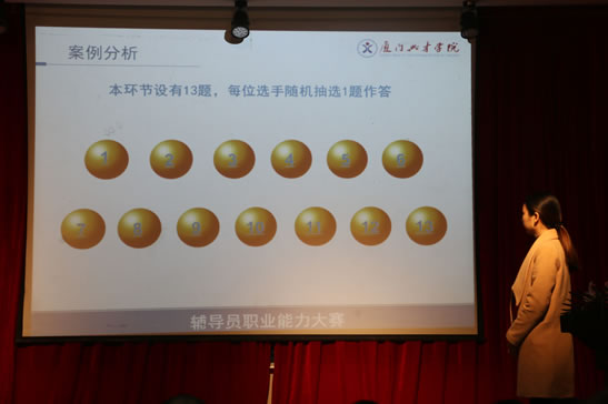 本次大赛分为初赛和决赛两个阶段,共有八个项目。初赛有基础知识测试、博文写作、班情熟知、主题班会和演讲比赛等项目,决赛包括案例分析、谈心谈话和评建知识竞赛等项目。全体辅导员参加初赛,表现均可圈可点,展示了我校辅导员队伍较高的职业素养。经过选手们的激烈的角逐和工作组老师的严格评审,共有13名辅导员进入决赛,其中1名选手来自管理学院,3名选手来自商贸学院,3名选手来自艺术与建筑学院,4来自工学院,2名选手来自必一运动 学院。