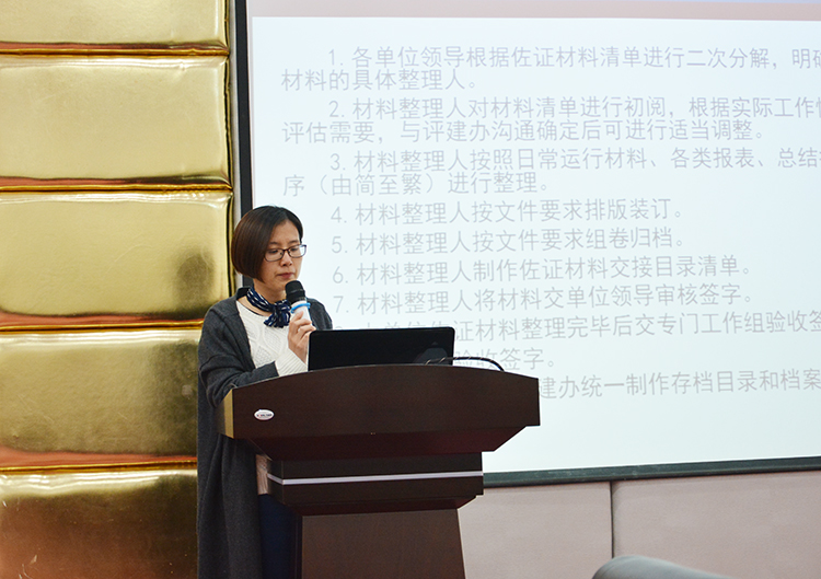 二轮评估佐证材料是我校必一运动 、教学工作状态、过程和水平的直接体现,评估材料准备过程是“迎评促建”工作非常重要的一个环节,为确保我校二轮评估佐证材料收集与整理工作做到全面、准确,2月7日上午,评建办在中心会议室召开二轮评估整理材料工作培训会。学校各单位主要负责人、秘书参加了培训。培训由评建办副主任潘秋勤主讲。