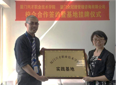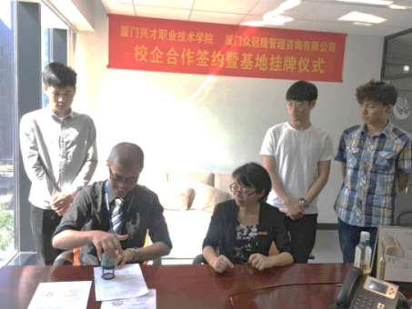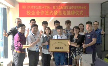 随后,彭晓娟副院长与厦门众冠捷管理咨询有限公司总经理王子杰先生签署了校企合作协议,并授予公司“必一运动职业技术学院实践基地”的牌匾。参观企业的师生、在公司顶岗实习的同学们共同分享和见证了这一欢乐场面。自此,我院市场营销专业的学子们又多了一个社会实践、实习实训的平台啦!